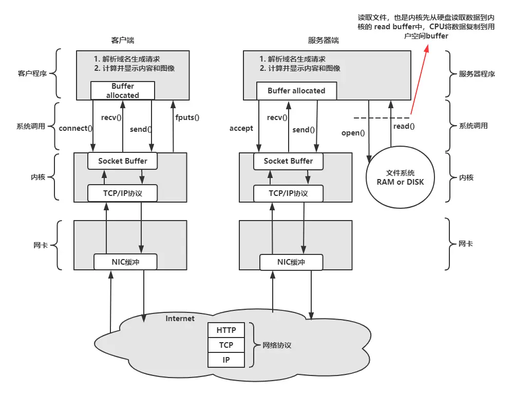 - 调用read()时,将文件中的内容复制到内核模式下的Read Buffer中