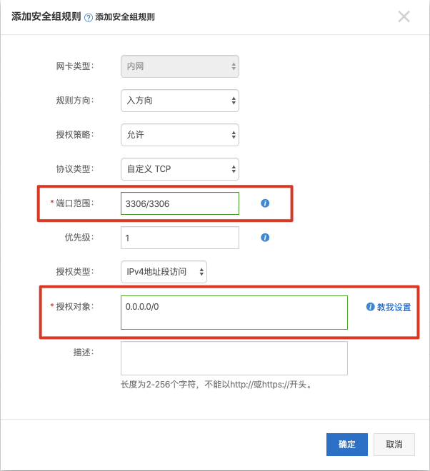 - 添加安全组规则只需要添加入方向的安全组,端口范围规则为「22/22」,授权对象为「0.0.0.0/0」,如下图就是一个3306的端口安全组