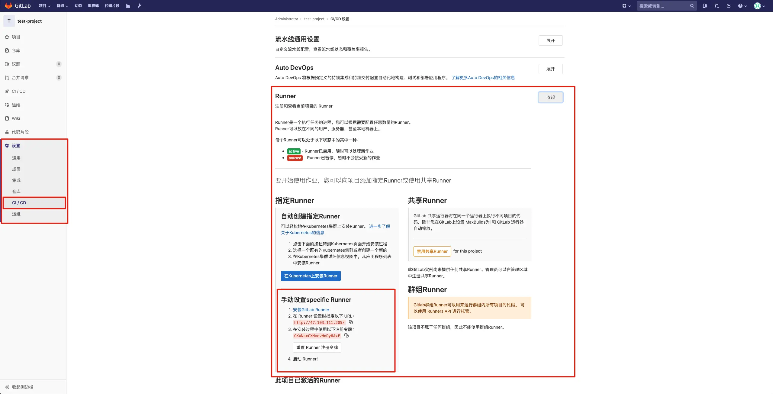 位于项目左侧 设置 - CI/CD - Runner ,因为我创建的是按量付费的实例,所以也不怕大家看😐