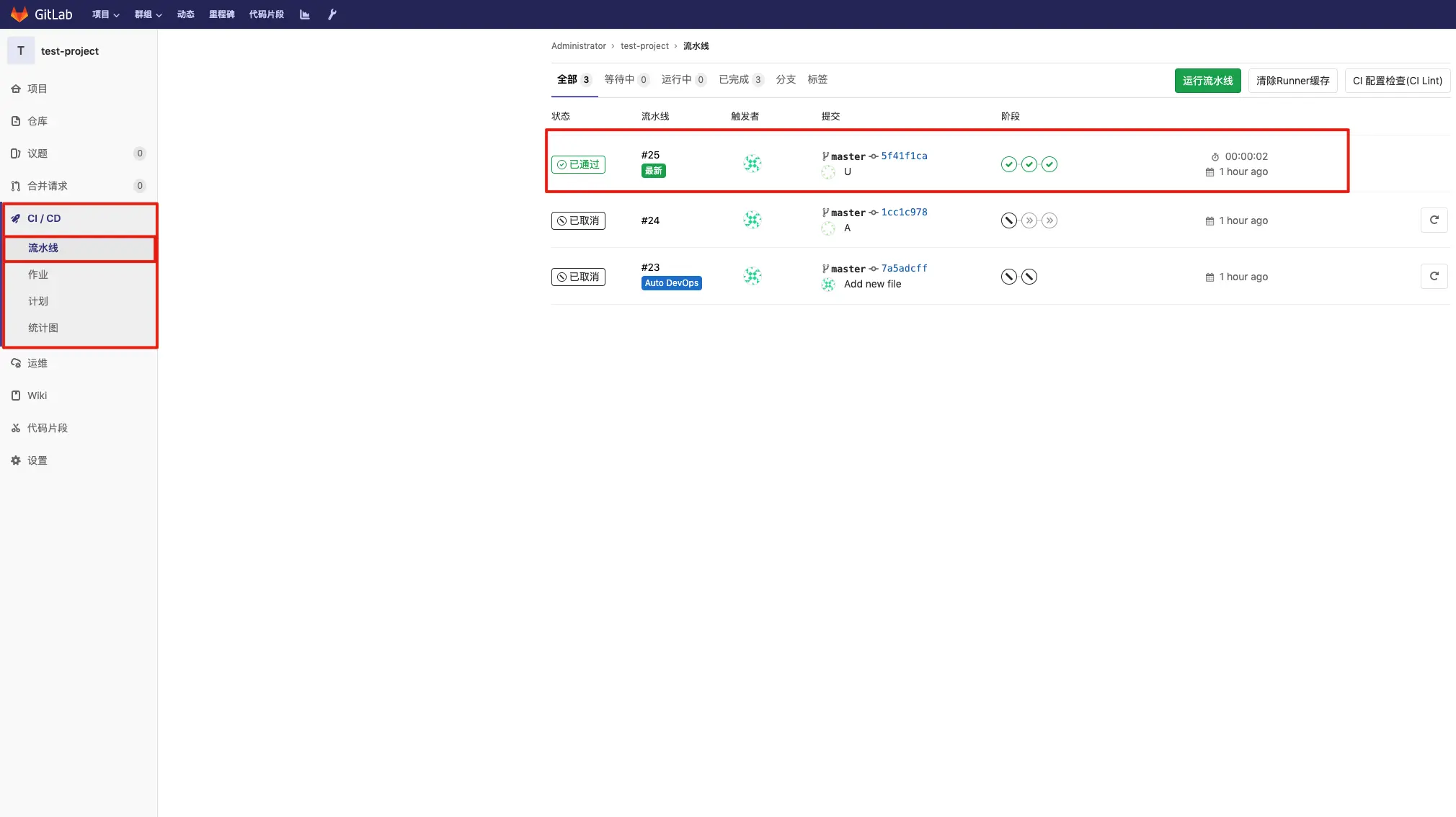 在安装好的 Gitlab-Runner 服务器上下拉代码,然后创建 .gitlab-ci.yml 文件,将下方的内容写入文件里保存上传,然后我们进入项目右侧的 CI/CD 中就可以看到结果了。