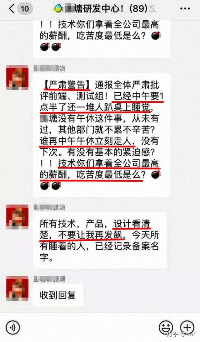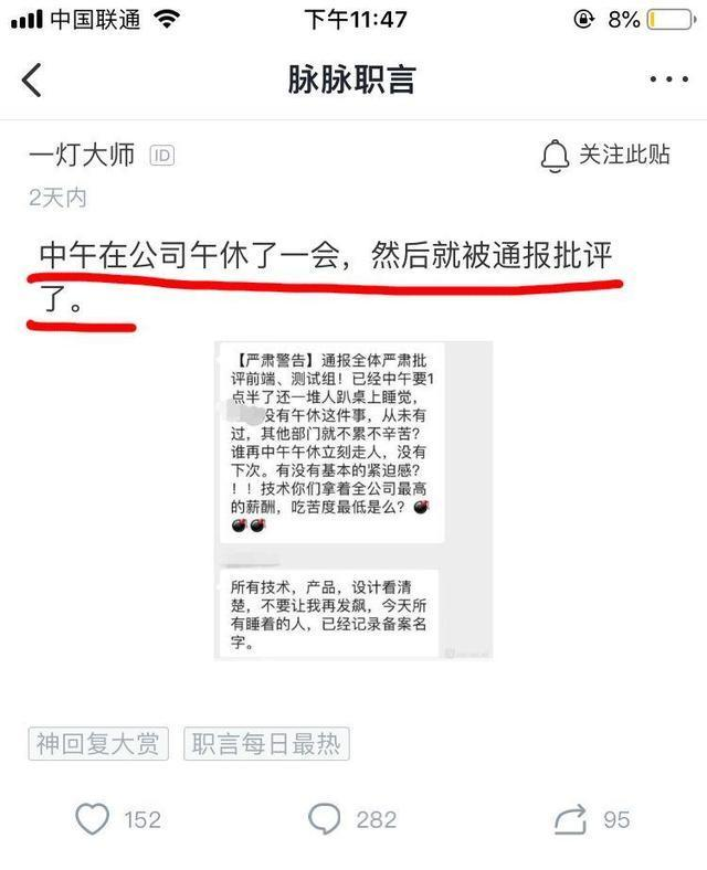 最近网友曝光的一家公司连午休都不让你睡了,谁午休直接开除。公司ceo在群里严重批评程序员中午睡到一点半,并连带产品和设计也一起警告。