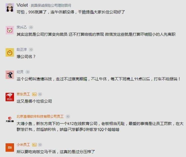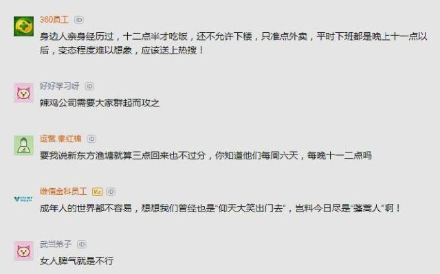 也有网友骂到: 她自己都不反思反思吗?如果没有其他前提条件的话,不是这个公司有问题,就是发言的这人有问题。员工没有充足的休息和调整时间,一味强调吃苦忍耐,这样的公司很有问题,不建议楼主长期持有。神经病吧~教育行业就是这么没落的。想起自己曾经也经历过这种,中午为了给领导做样子,小领导不让午休,这公司还是趁早走了好,精神都有问题。
