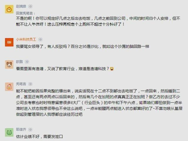 当然也有网友持不同的意见: 能不能把前因后果完整的爆出来,说实话现在十二点不到都出去吃饭了,一点回来,然后睡到二点,甚至还有两点两点以后回来的,然后有几个在加班的点真真正正在加班?做乙方的去过不少公司去考察也时时特意留意很多it大厂(行业巨头)的中午和下午六点,如果咱们哪怕做到一点半准时进入状态我想领导也不会这么说吧,一点半能醒两点能进入状态都算好的了~不喜勿喷从基层做起到管理层的人我想都应该经历过吧。