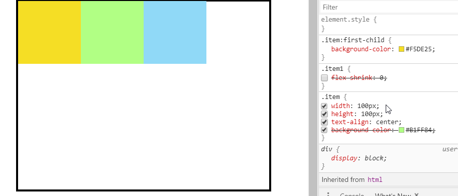 如果所有项目的flex-shrink属性都为1,当空间不足时,都将等比例缩小。如果一个项目的flex-shrink属性为0,其他项目都为1,则空间不足时,前者不缩小。