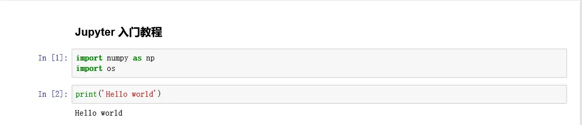下图展示了一个简单的例子,第一行 Jupyter 入门教程 这个就是一个 Markdown cell ,这里展示的是执行这个 cell 的结果,如果需要执行一个 cell ,可以点击 Run 按钮,或者快捷键 Ctrl + Enter 即可,然后下方两个都是 code cell ,第一个是导入第三方库,第二个则是打印一段话以及其运行结果。