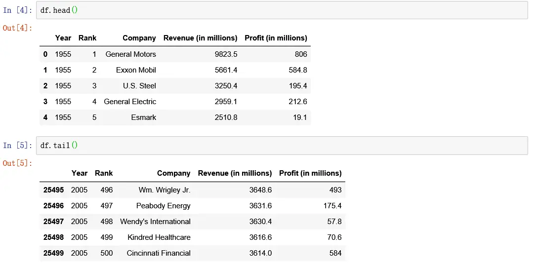 通过查看,我们了解到每行就是一个公司在某一年的数据,然后总共有 5 列,分别表示年份、排名、公司名字、收入和利润。