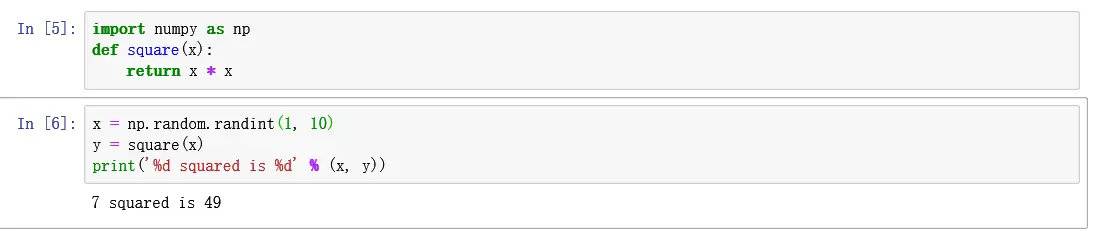 这里同样用一个代码例子进行介绍 kernel 的这种特性,如下图所示,分别在两个单元内输入两段代码,第一个单元内时导入 numpy 并定义函数 square(),而第二个单元内就调用了这个函数 square() ,并成功运行输出结果。