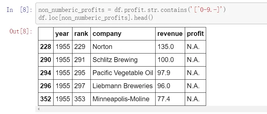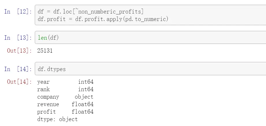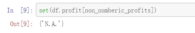 这里可以发现 profit 数据类型居然是 object 而不是和收入 revenue 一样的float64 类型,这表示其中可能包含一些非数字的数值,因此我们需要检查一下: