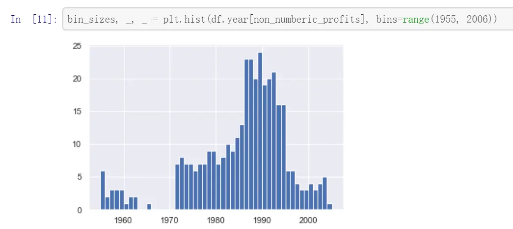 从结果看,缺失数据最多的一年也就是 25 条也不到,相比每年 500 条数据,最多占据 4%,并且只有在 90 年代的数据缺失会超过 20 条,其余年份基本在 10 条以下,因此可以接受直接删除缺失值的数据,代码如下: