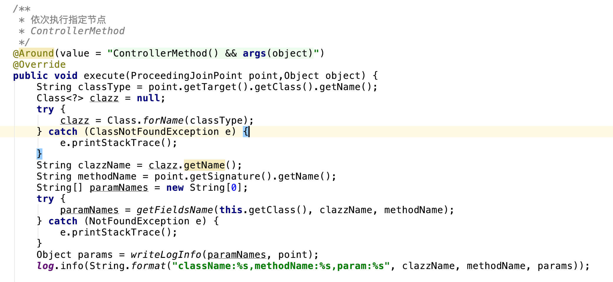 使用AOP获取被调用方法的入参,然后用@Around触发业务方法,将获取到的参数传递下去,如: 想要获取AutoServiceImpl.excute(),中的Role