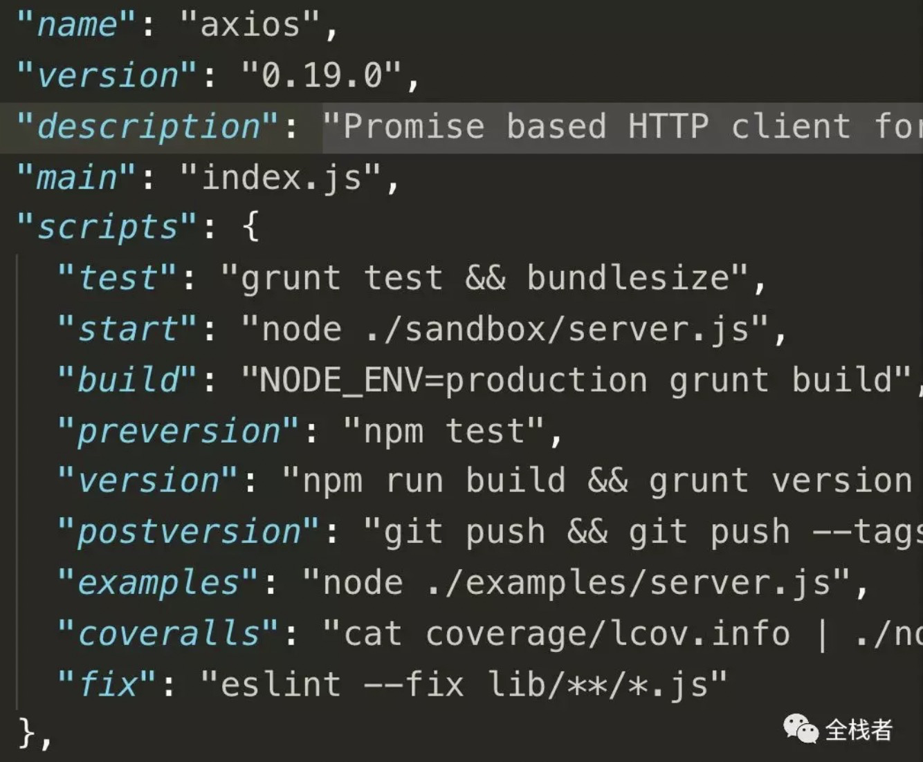 1、教大家怎么看NPM包的源码,第一步先看package.json,主要关注package.json中的main字段,它的值(一个相对路径)代表这个包的入口文件。这里可以看出axios的包的入口文件是index.js文件,再看一下包的scripts执行脚本,然后可以在本地执行脚本进行调试。