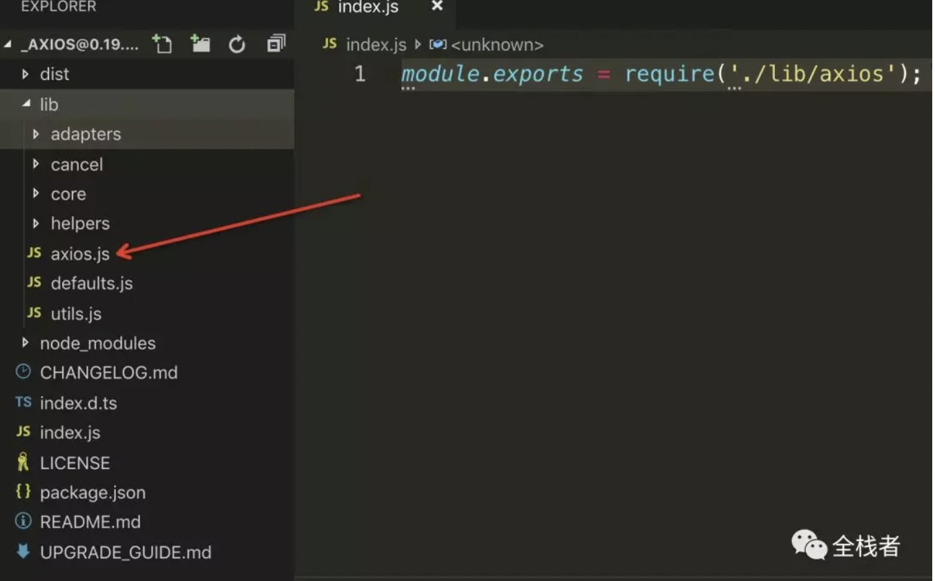 2、[Axios/axios.js]进入入口文件,可以看出axios的内部逻辑均在lib文件夹下。