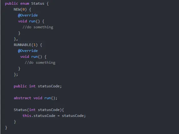 发现很多同学不知道在枚举中可以定义方法,这里定义一个表示状态的枚举,另外可以实现一个run方法。