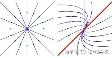 注:定点的稳定性,取决于泰勒展开的不为零的第一项的正负。左图为稳定平衡,右图为不稳定平衡,虽然均为定点,但周边性质迥异。