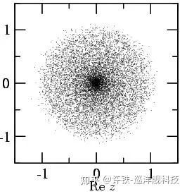假定矩阵元素为a,对于情况一我们得到的两个特征值是-a和a的两个实数, 对于情况2我们有-ai和ai也就是把它们换到虚轴上(这正是刚刚说的谐振子解)。 由此你进行一个类推, 如果我的矩阵的元素不在是这两个特殊情况而是随机的, 我只保证这些矩阵元素每个的期望均是0, 然后你要求出特征值的分布会是什么样的? 刚刚的解一个是沿着实轴相对原点对称, 一个是沿着虚轴相对原点对称。 如果综合起来呢? 在实轴和虚轴组成的复平面上, 我们会得到任意方向沿着原点对称的一组点, 从而组成最完美的一个图形- 也就是, 一个圆! 具体求解请见论文(Introduction to Random Matrices-Theory and Practice)。