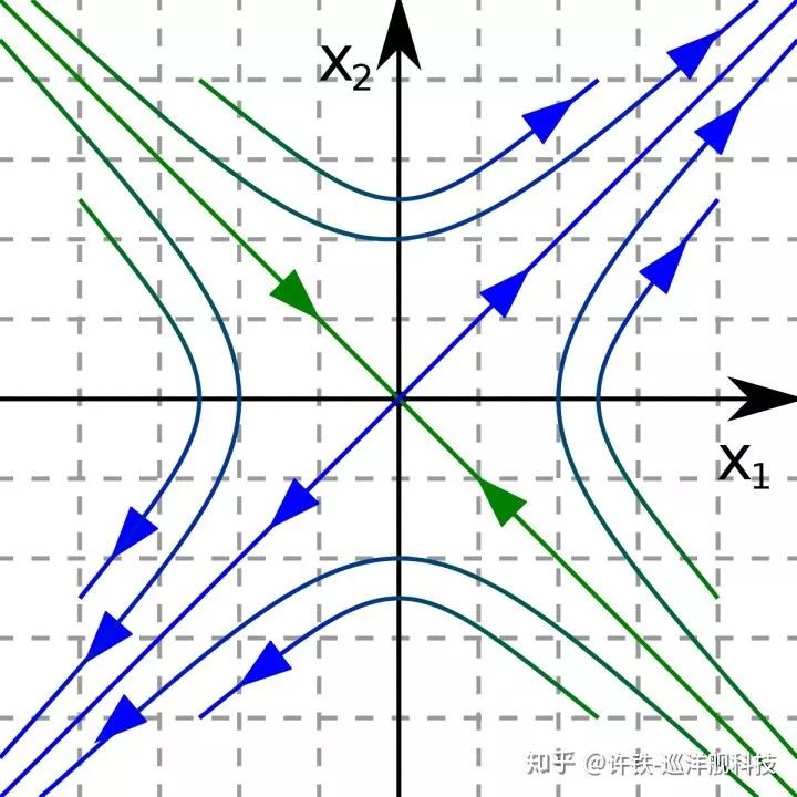 Y轴下半及整个下半平面:鞍点(Saddle)与上半的区别在于运动方式, 刚刚说的转动变成线性, 然而依然是从稳定到不稳定的临界,此处的效果是从一个特征向量方向你趋于定点(稳定),而另一个方向则远离(不稳定)。 这样的系统可以表示神经网络的决策或分类: 从一个方向得到的结果是A, 从另一些方向得到的结果是B,这就是天然的分类器。鞍点也用来介导一个动力系统的相变, 从一个方向你达到定点, 再在另外一个方向分离, 例如所有的热恋到失恋的过程。