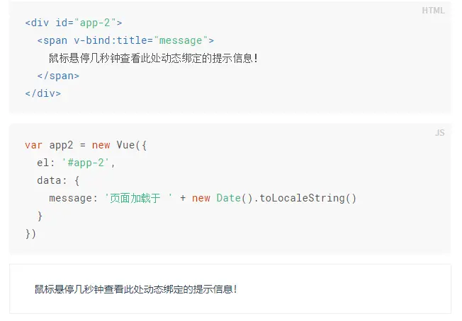 上述例子中的v-bind特性被称为指令。指令带有前缀v-,以表示他们是Vue提供的特殊特性。他们会在渲染的DOM上应用特殊的响应式行动,上述例子中这个指令的意思是:将这个元素节点的title特性和Vue实例的message属性保持一致。