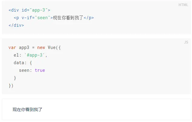 <p v-if="seen">现在你看到我了</p>这里,v-if 指令将根据表达式 seen 的值的真假来插入/移除 <p> 元素。(也就是说用v-if后面的属性值(true/flase)来控制元素(p标签)是否显示。