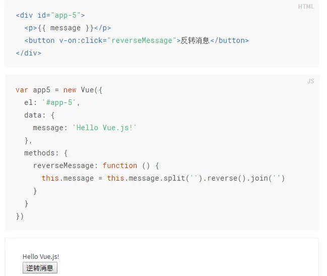 注意:在message方法中我们更新了应用的状态,但没有触碰DOM--所有的DOM操作都由Vue来处理。