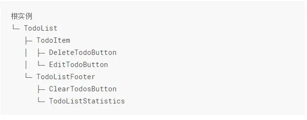 一个Vue应用由一个通过new Vue创建的根Vue实例,以及可选的嵌套的、可复用的组件树组成。举了例子,一个todo应用的组件树可以是这样的: