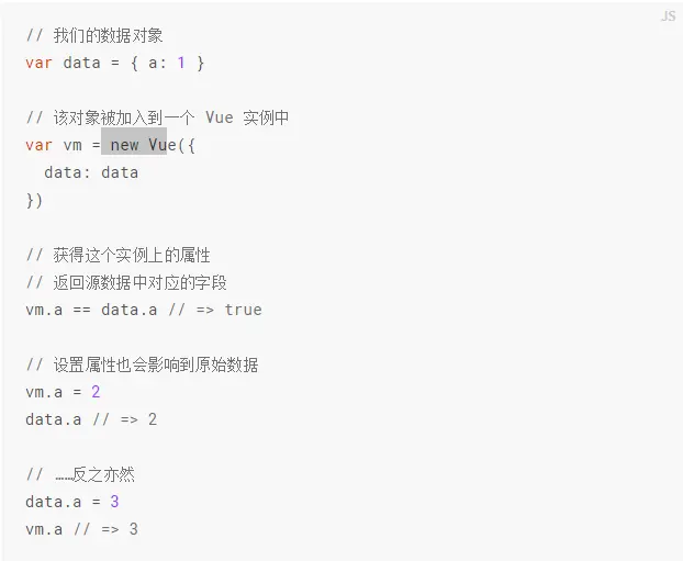 当这些数据改变时,视图会进行重新渲染。值得注意的是只有当实例被创建时 data中存在的属性才是响应式的。也就是说如果你添加一个新的属性,比如: