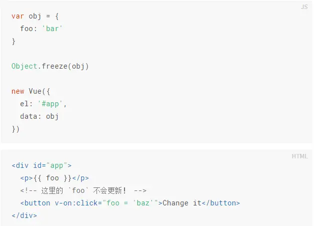 这里唯一的例外是使用Object.freeze(),这会阻止修改现有的属性,也意味着响应系统无法再追踪变化。