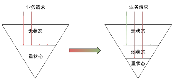 提升系统扩展性的关键在于减少有状态组件的范围,在路由和服务发现组件的帮助下,系统中的无状态组件可以非常轻松的扩展扩容。所以通过扩大无状态服务的范围,收缩重状态服务的比例可以显著的帮助我们提升整个系统的可扩展性。除此之外如果我们能够设计一些可以从外部系统恢复状态的弱状态服务,那么我们往往可以利用弱状态的组件来部分替代重状态组件。随着弱状态组件的扩大和重状态组件的收缩,整个系统的可扩展性可以得到进一步的提升。