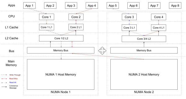 在过去的几十年中工业界为了提升计算机系统的性能,在计算机系统中添加了更多的CPU 乃至更多的核心。随着 CPU 内部处理能力的不断增强我们还为 CPU 加上多级的缓存来弥补主存在带宽和时延上同 CPU 的巨大差距。除此之外我们还进一步把主存连同 CPU 分成多组让他们之间有更快的本地连接,只有当需要交叉访问远程内存的时候再通过互联总线进行交流。在这样一个系统里大部分的读写操作都发生在离核心最近的 L1 或者 L2 cache 里,而在修改主存中数据的时候则需要更加复杂的机制和更长的时间来达成缓冲的最终一致。为了能将计算机系统的性能发挥到极致工业界不断的改进体系结构,在这个架构中处处都体现着设计的取舍和智慧。