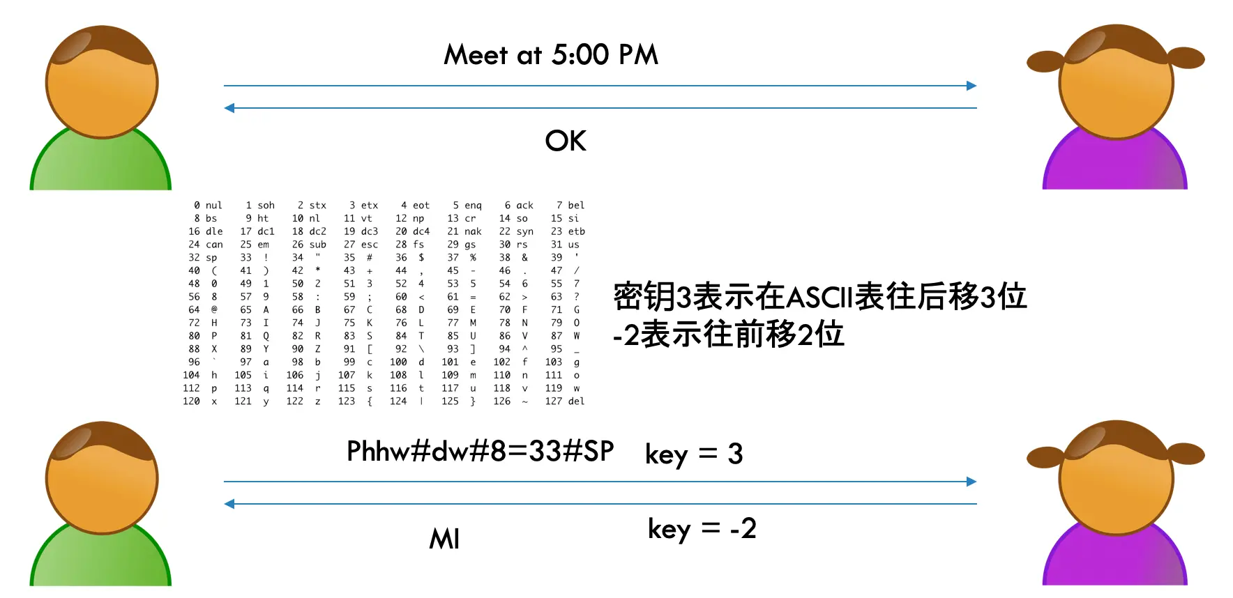 他想发送的数据的数据是"Meet at 5:00 PM"(5点见面,如果是中文的话可以使用UTF-8编码),加密方式是直接在ASCII表进行左移或右移,他的密钥是3,表示在ASCII表往后移3位,就会变成"Phhw#dw#8=33#SP",这样一般人如果截获了不知道是什么意思的。但是我们可以想一下,如果既然他可以载获你的数据,自然也可以截获你的密钥,进而进行解密,如下图所示: