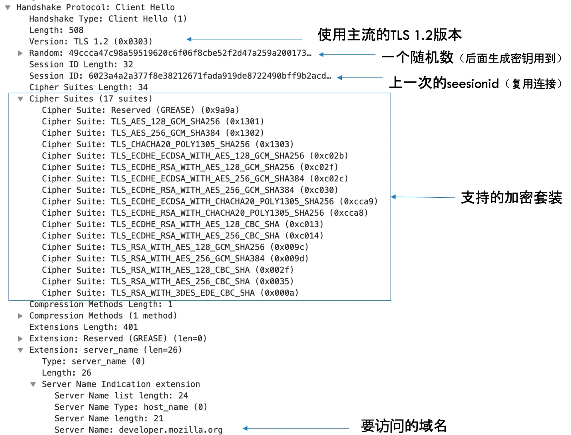 在Client Hello里面客户端会告知服务端自己当前的一些信息,如下图所示: