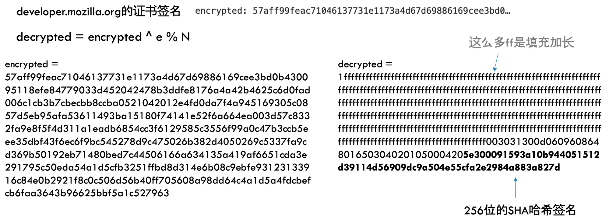 然后我们用这个CA的公钥对mozilla.org的证书签名进行解密,方法和上面的类似: