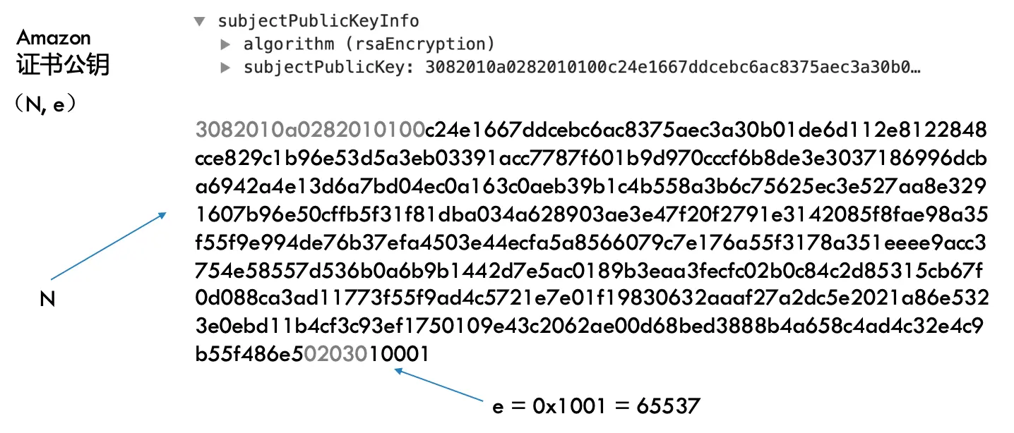 它里面包括了证书的公钥、证书的适用公用名、证书的有效期还有它的签发者等信息。Amazon的证书也具备上述结构,我们可以把Amazon证书的公钥拷出来,如下图所示: