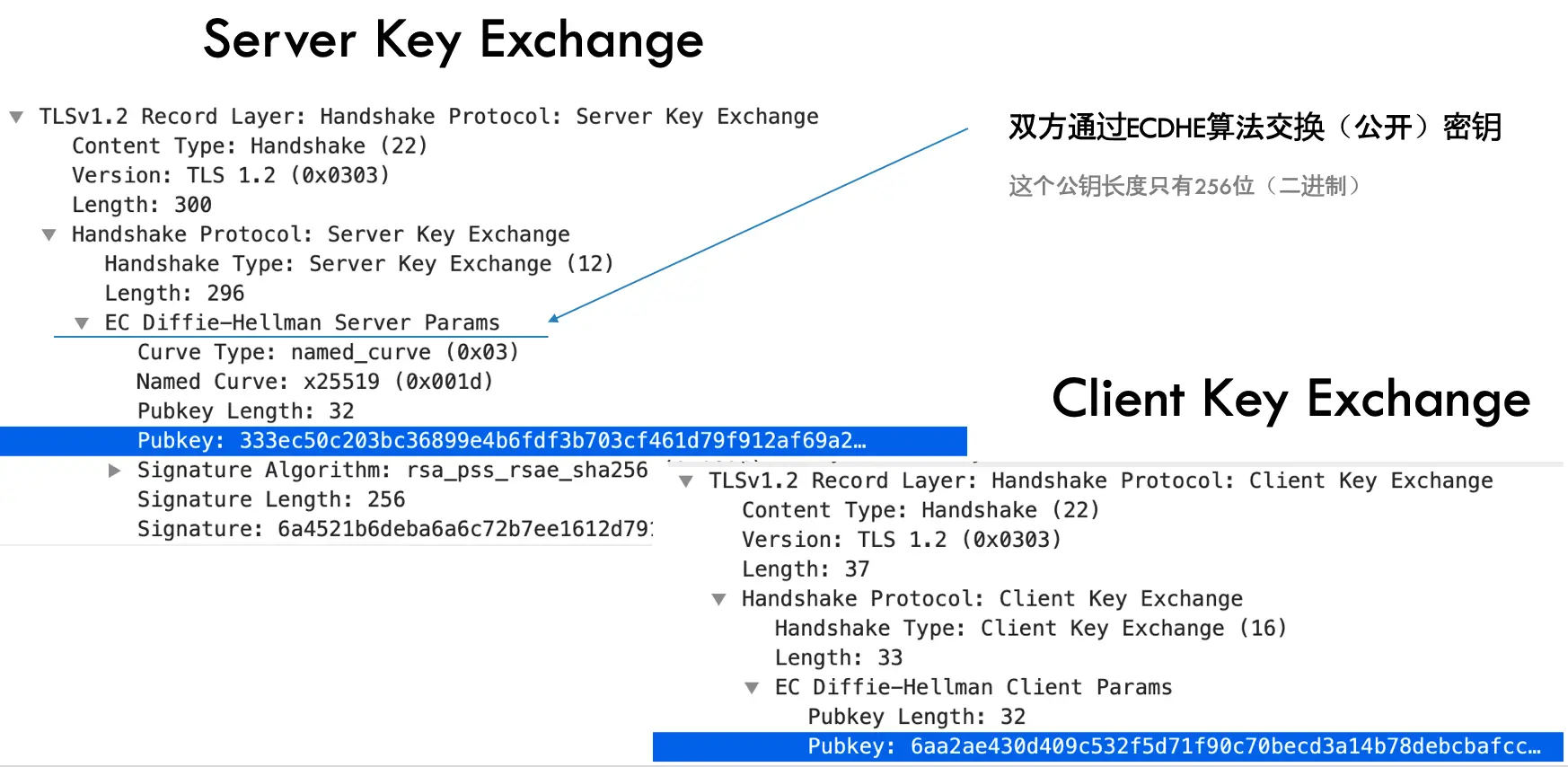而曲线方程是规定好的,例如Curve X25519使用的曲线方程为:y^2 = x^3 + 486662x^2 + x,在密钥交换里面会指定所使用的曲线方程,如下图所示: