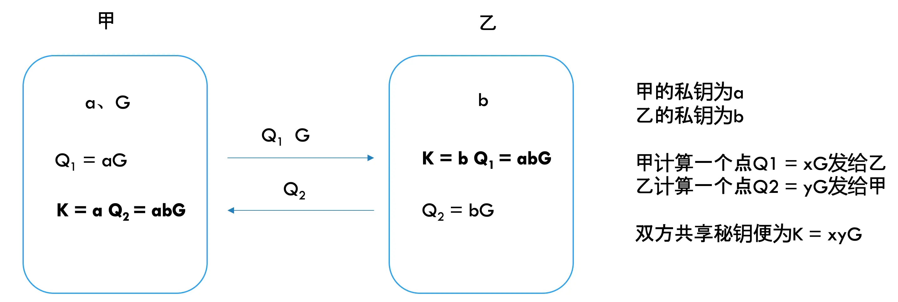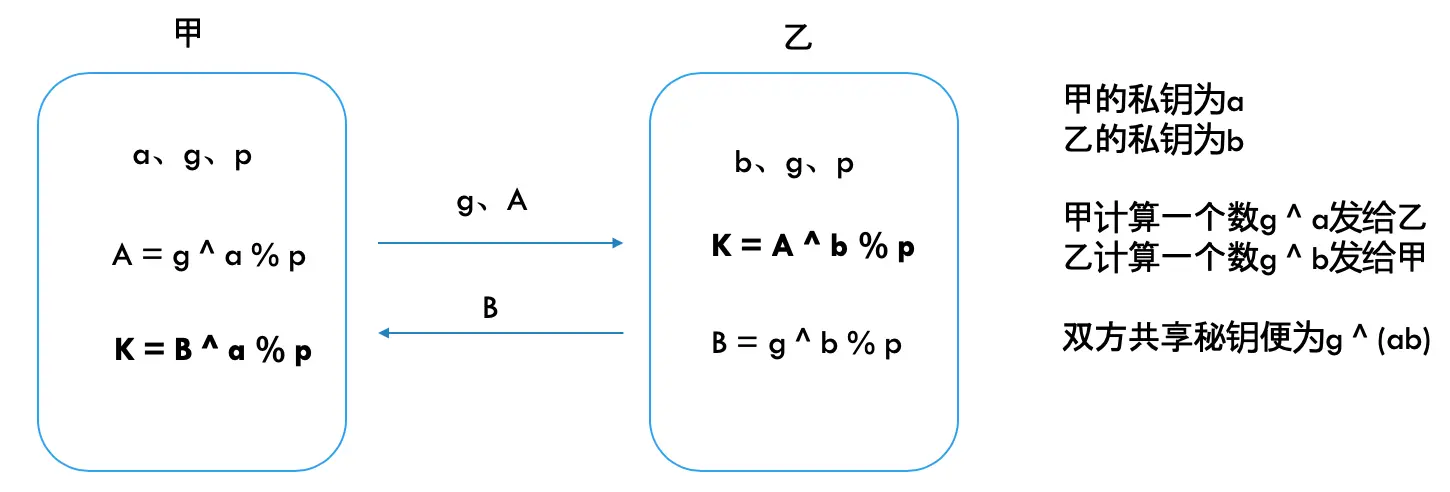 为了得到共享秘钥K,甲用它的私钥计算一个数g ^ a,发送给乙,乙的私钥为b,乙便得到K = g ^ a ^ b,同时发送g ^ b给甲,甲也得到了K = g ^ b ^ a。这个应该比较好理解,而引入椭圆曲线加密能够提高破解难度。