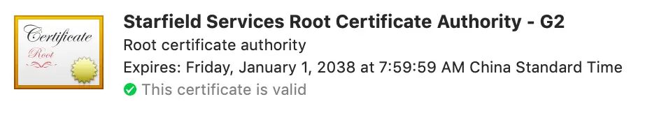 第一个证书的公用名(common name)就是我们当前访问的域名developer.mozilla.org,如果公用名是*.mozilla.org的话那么这个证书便能给mozilla.org的所有二级子域名使用。第二个证书是第一个证书的签发机构(CA)的证书,它是Amazon,也就是说Amazon会用它的私钥给developer.mozilla.org进行签名。依此类推,第三个证书会给第二个证书签名,第四个证书会给第三个证书签名,并且我们可以看到第四个证书是一个根(Root)证书。