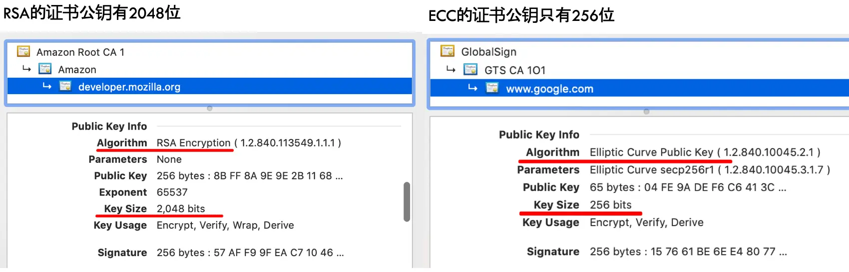 现在的证书的签名算法有两种,RSA和新起的EC,如下图所示,google.com便是使用的ECC证书: