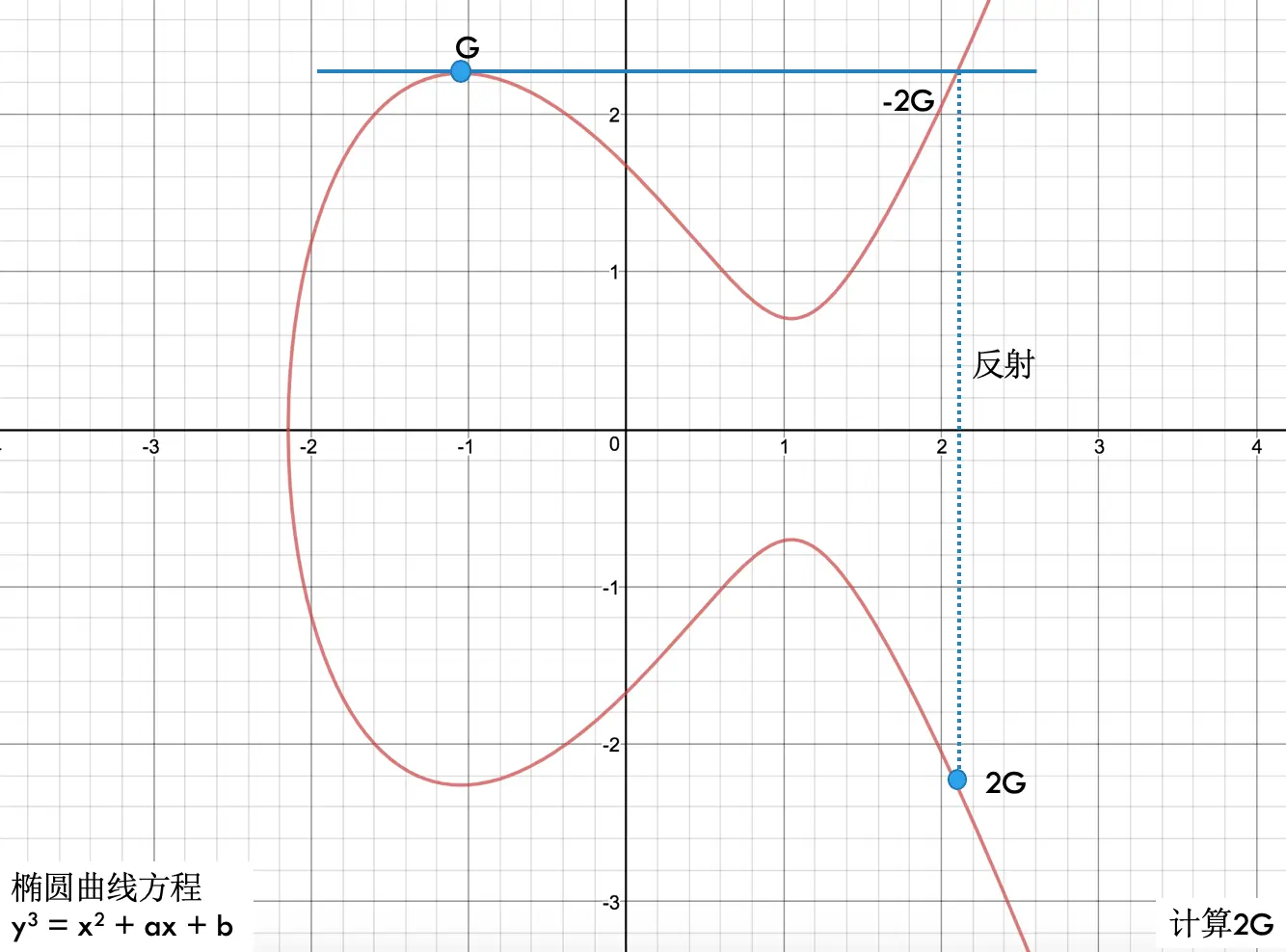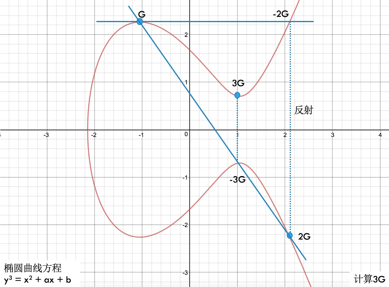 给定一个起点G(x, y),现在要计算点P = 2G的坐标,其过程是在G点上做一条线与曲线相切于-2G,做-2G相对于x轴的反射便得到2G点。为了计算3G的坐标,如下图所示: