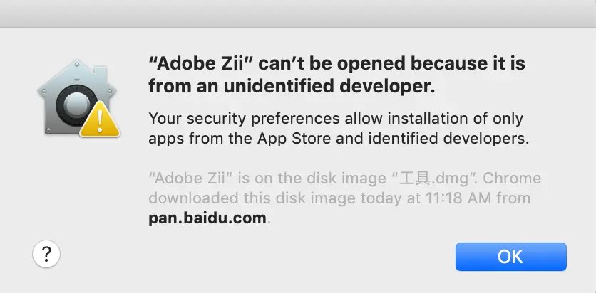 还有一种证书叫客户端证书,同样需要向CA机构申请一个客户端证书,和服务端TLS证书不一样的地方是,服务端证书通常是和域名绑定的,而客户端证书可以给本地的任意可执行文件进行签名。签名验证算法和上文讨论 的TLS证书一致。为什么可执行文件需要签名呢,因为如果不签名的话,系统会拦截安装或者运行,如Mac双击一个未签名的dmg包的提示:
