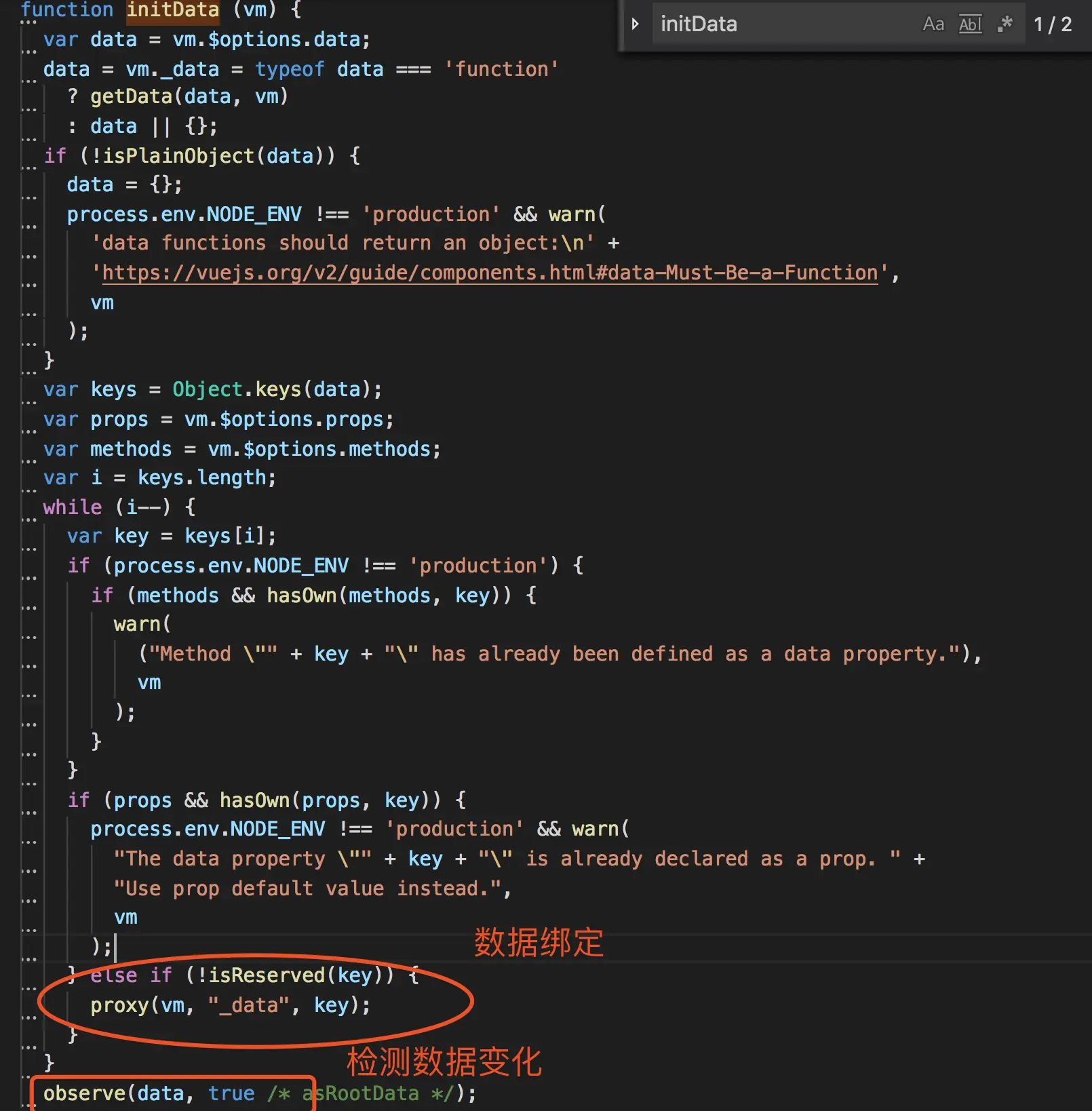 从源码中可以看到initData主要是做两件事,一件是遍历data中定义的数据,然后通过 proxy 把每一个值 vm._data.xxx 都代理到 vm.xxx 上;这样我们就可以通过this.xxx访问到数据。另一件是调用 observe 把 data的数据 变成响应式对象。上一篇《vue源码阅读之数据渲染过程》已经分析过initData数据绑定到实例的过程。这部分就不在赘述。