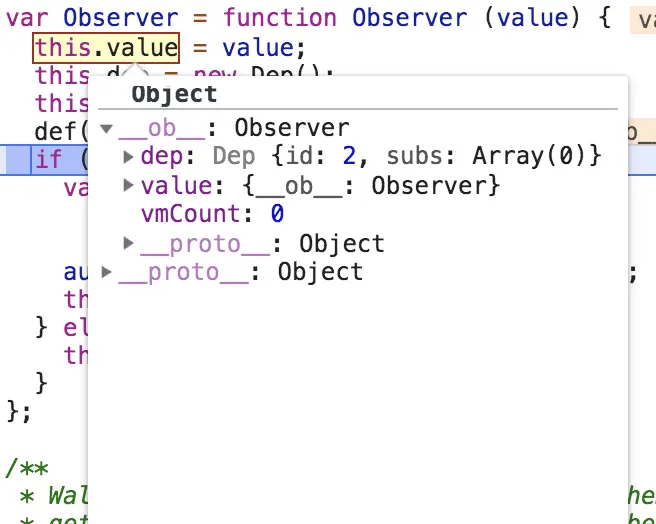 - 调用def函数为对象添加__ob__属性,__ob__中包含value数据对象本身、dep依赖收集器、vmCount。此时数据经过这个步骤以后的结构如下: