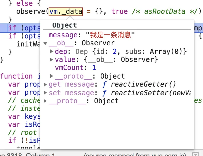 经过defineReactive处理的数据data:{message:"我是一条消息"}变为如下结构, 每个属性都有自己的dep、childOb、getter、setter,并且每个object类型的属性都有__ob__。