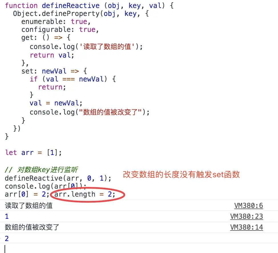 接下来再分析当传入data为数组的时候,如何创建响应式对象。我们发现Object.defineProperty对数组进行响应式化是有缺陷的。虽然我们可以监听到索引的改变。但是defineProperty不能检测到数组长度的变化,这是因为数组的length属性是不能添加getter和setter,所有无法通过观察length来判断。准确的说是通过改变length而增加的长度不能监测到。这种情况无法触发任何改变。举个例子:
