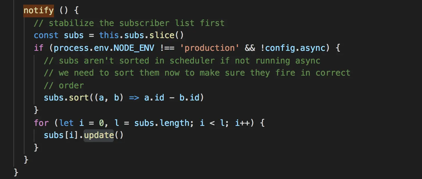 dep.notify()函数关键就是循环遍历所有订阅者。也就是数组subs中存放的watcher。然后调用每个watcher的update函数。