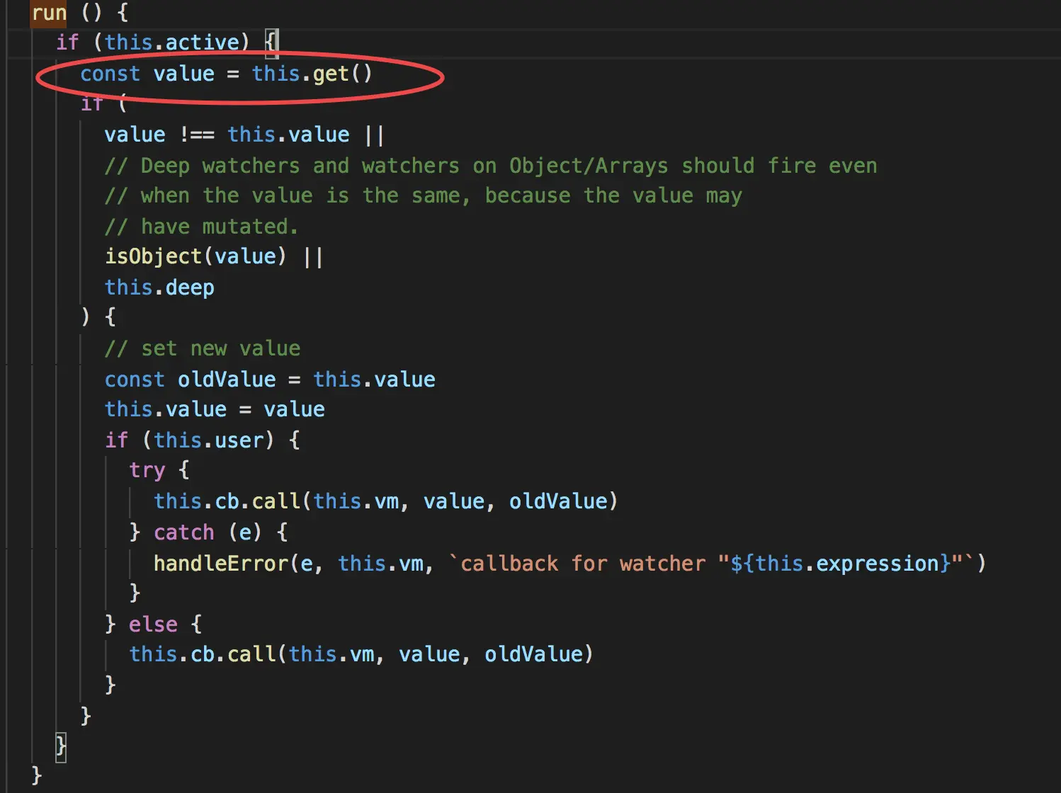 run方法中会执行this.get()。就会执行this.getter.call(vm, vm)。而this.getter函数指向updateComponent。
