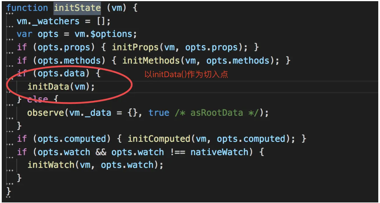 先回顾一下ininState函数。在 initState 函数内部使用 initProps 函数初始化 props 属性;使用 initMethods 函数初始化 methods 属性;使用 initData 函数初始化 data 选项;使用 initComputed 函数和 initWatch 函数初始化 computed 和 watch 选项。其中initData几乎涉及了全部的数据响应相关的内容。所以以 initData 为切入点为大家讲解 Vue的响应系统。让大家在自己分析props、computed、watch 等属性的响应式原理时会更加容易。