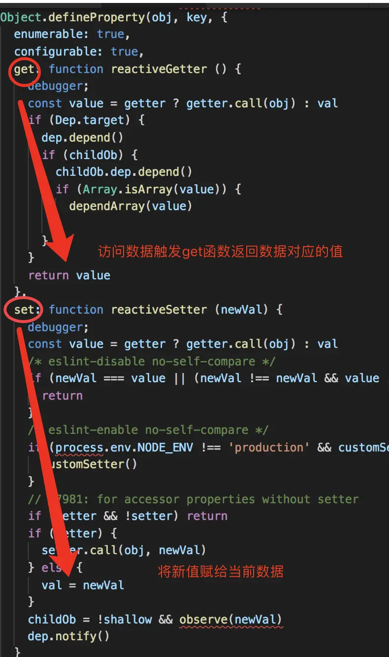 - 通过Object.defineProperty为对象中的每一个属性都加上getter、setter方法。当我们访问一个值时,就会调用get方法并返回该属性对应的值。当我们修改某个属性的值时就会调用set方法就会将新值赋给当前属性。这样就完成了响应对象的创建。