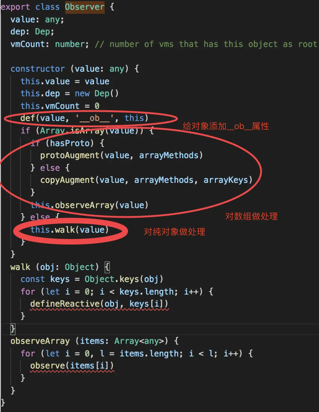 observe 方法的作用就是给非 VNode 的对象类型数据添加一个 Observer,如果已经添加过,表示当前数据已经是响应式对象了,则直接返回,数据没有被observe过,且数据是array或object类型,那么将执行new Observer(data),所以Observer类接收的是对象和数组。接下来我们来看一下 Observer 的做了什么事。