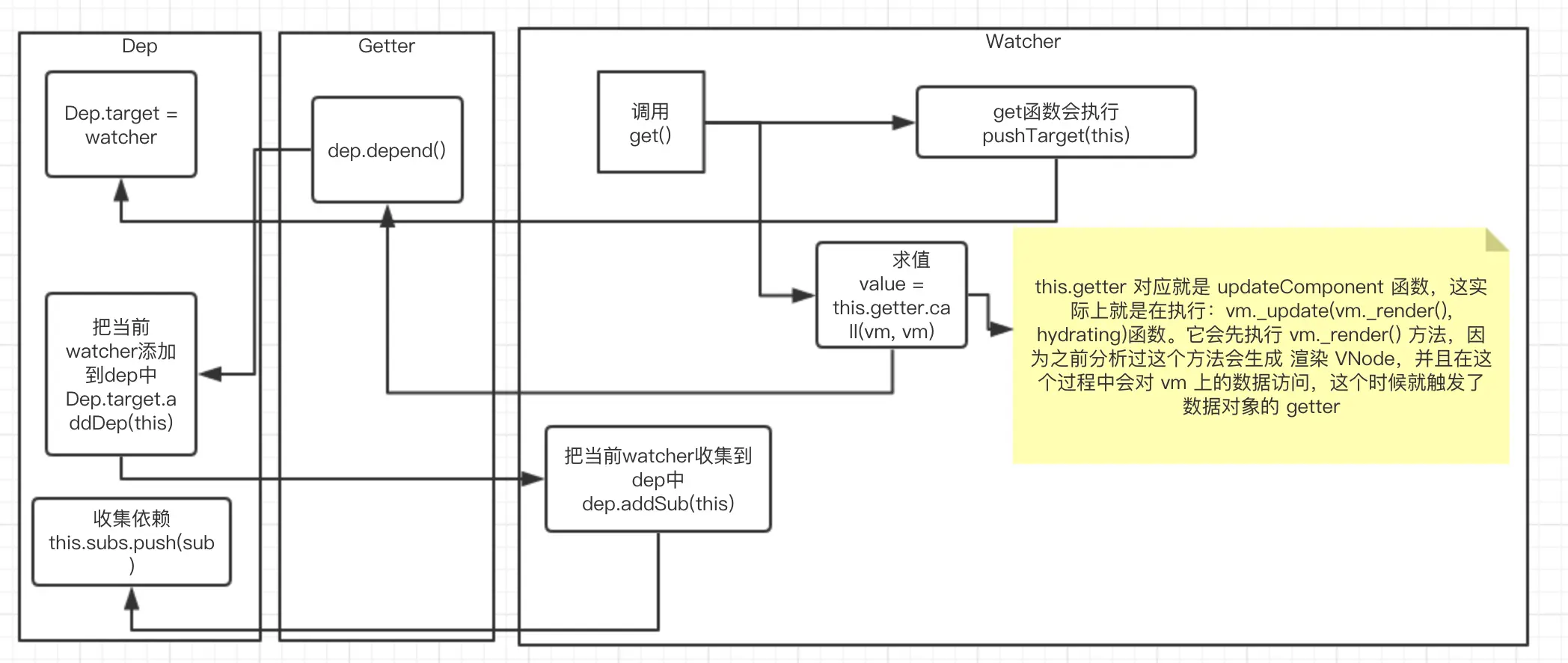 也就是说把当前的 watcher 订阅到这个数据持有的 dep 的 subs 中,这个目的是为后续数据变化时候能通知到哪些 subs 做准备。下图是依赖收集的流程。