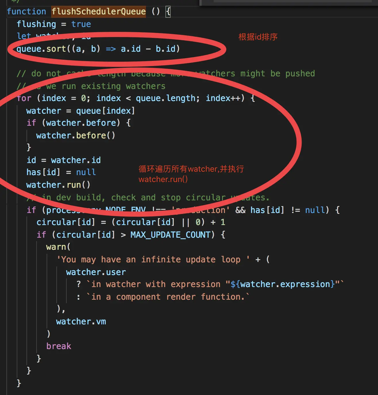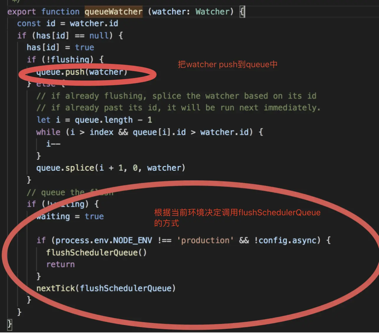 首先分析一下非生产环境且非异步的情况,会直接执行flushSchedulerQueue。