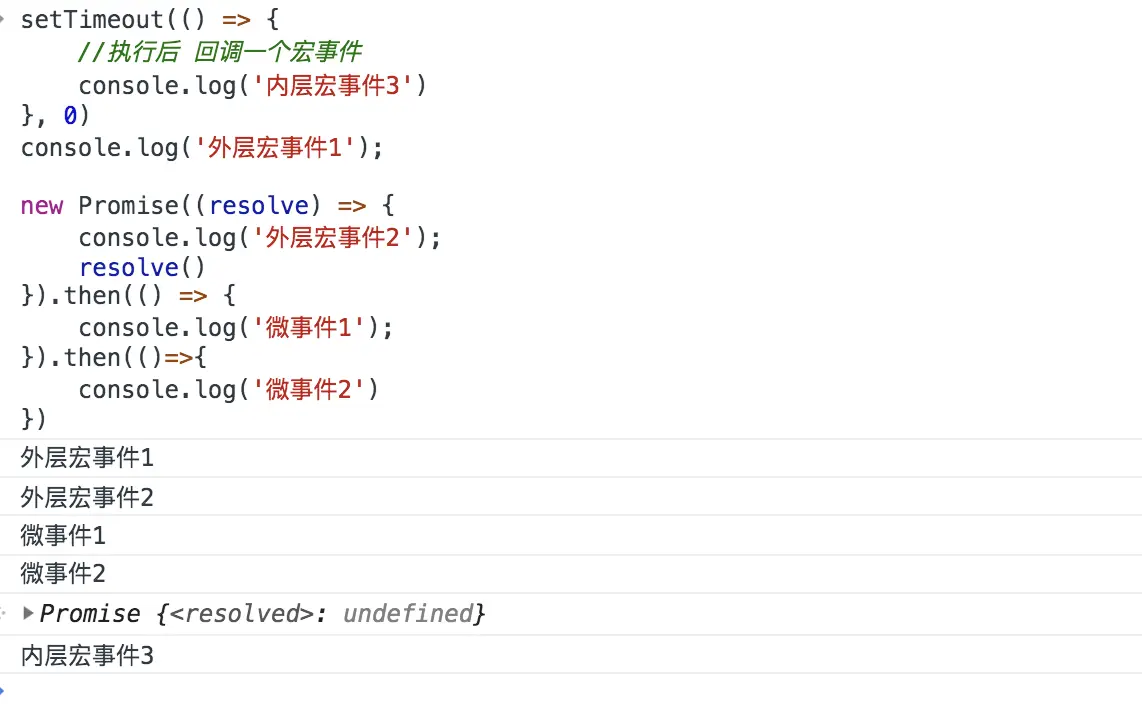 第一轮微任务执行完毕,执行第二轮宏事件,打印setTimeout里面内容'内层宏事件3'